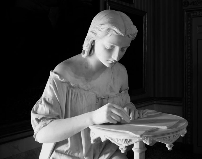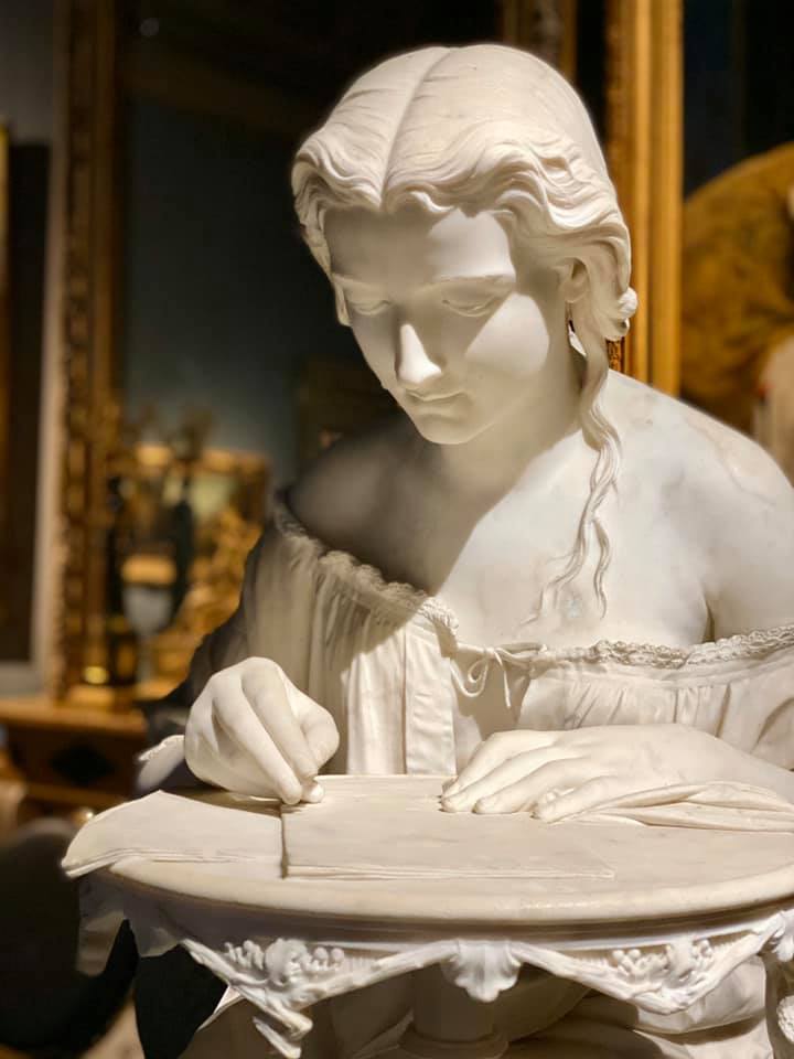 Undoubtedly his most famous work is La Scrittrice which Spertini proposed first to the Promotrice of Florence in 1867 and then to Brera. The most incredible thing about this sculpture is the precision with which the artist creates even the smallest details. The carvings of the wooden table, the rendering of the sheets, the lace and even the stitches of the nightgown.