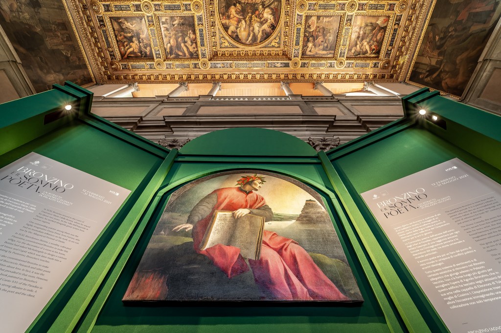 Si tratta dell’esposizione del ritratto di Dante dipinto da Agnolo Bronzino e oggi appartenente a una collezione privata. Stando a quanto racconta il Vasari nelle Vite, il dipinto a olio su tela fu commissionato all’artista dal banchiere fiorentino Bartolomeo Bettini assieme ai ritratti del Boccaccio e del Petrarca. L’opera fu realizzata fra il 1532 e il 1533 ed era destinata a decorare una camera del colto banchiere assieme agli altri “poeti che hanno con versi e prese toscane cantato d’amore”