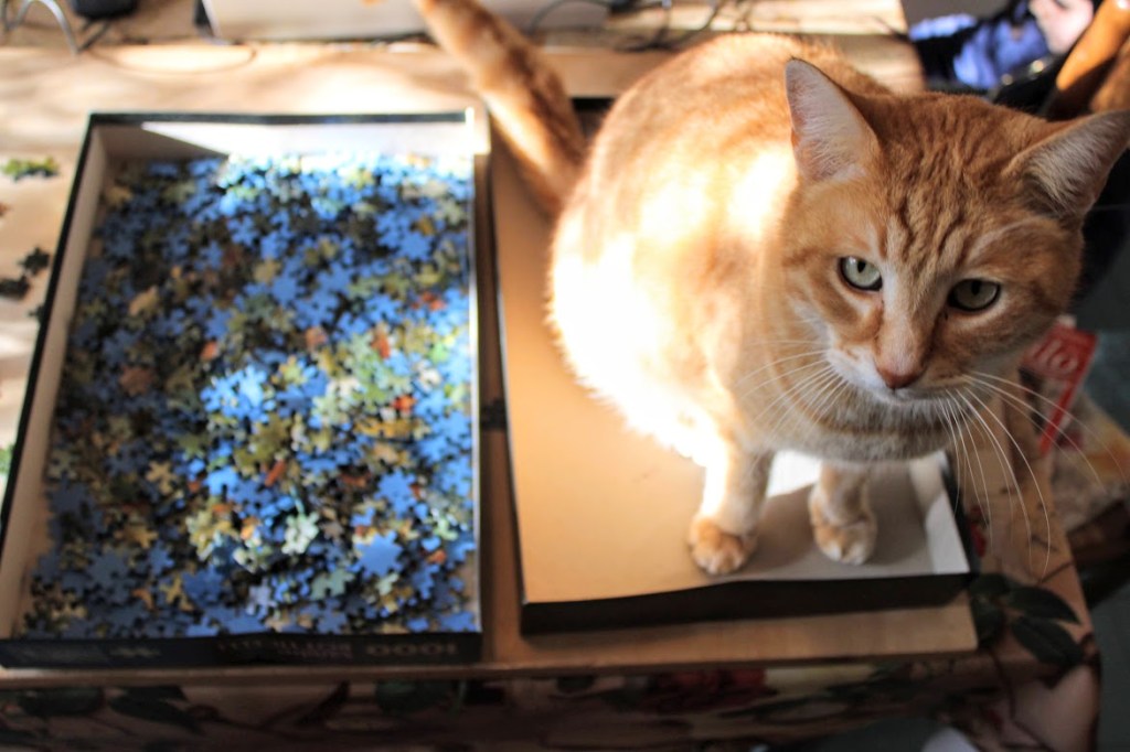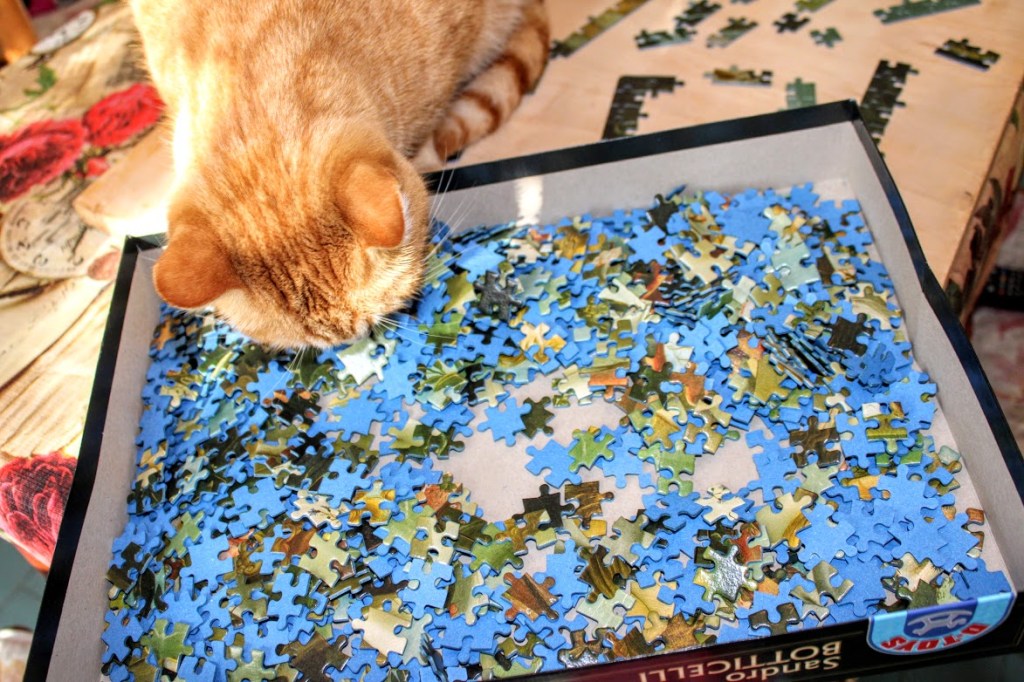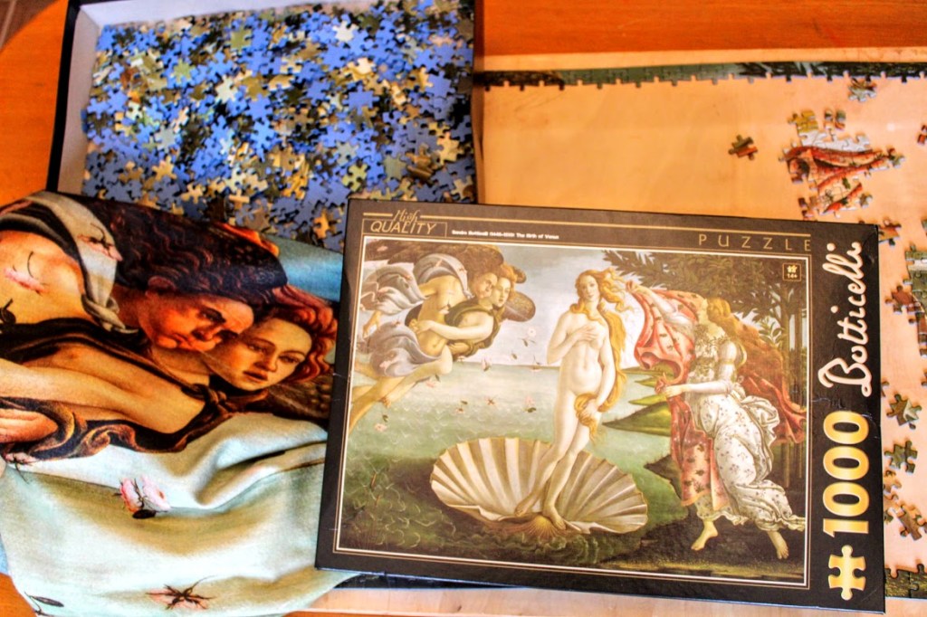 Con il lockdown di marzo prima e con le attuali restrizioni frutto di questo momento così particolare che stiamo vivendo, ho riscoperto il piacere di vedere formare sotto le mie mani, pezzetto dopo pezzetto, i dipinti più celebri della storia dell’arte. Al momento mi sto cimentando con la riproduzione della Nascita di Venere del Botticelli che ho trovato sul sito Puzzle Arte della Sherwood Store. Giuseppino ne approfitta e s’accovaccia nel coperchio della scatola facendo pure le fusa.