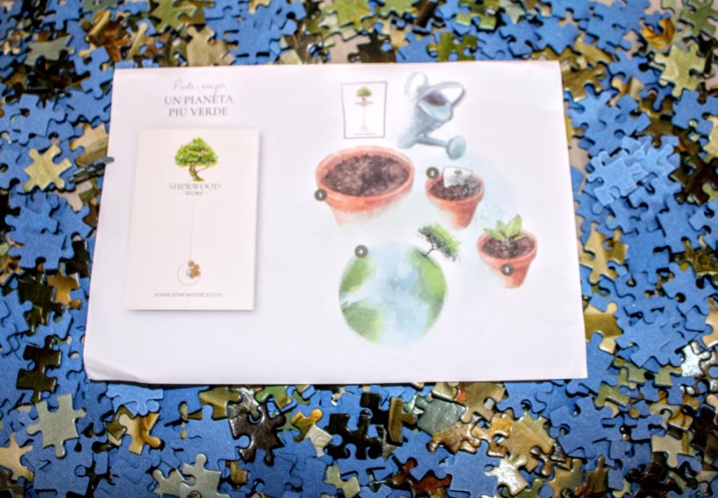 Nella confezione del puzzle di Sherwood Store ho trovato dei semi da mettere a dimora e appena smetterà di piovere e potrò mettere il naso fuori di casa li pianterò nel mio giardino. I Puzzle d’Arte fanno bene all’ambiente: il 10% degli introiti ricavati da Sherwood mediante le vendite effettuate sul sito, vengono destinati al rimboschimento delle foreste tramite Treedom e alla realizzazione di importanti progetti educativi nei comuni, nelle scuole e nelle piazze. Una lodevole iniziativa da sostenere e promuovere.