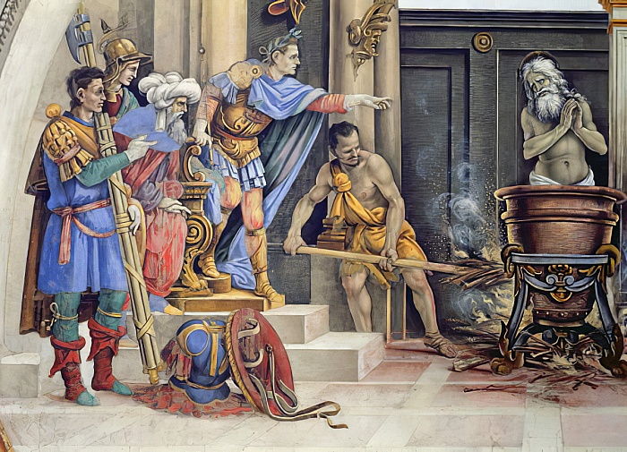 Nella lunetta superiore San Giovanni viene messo in un calderone pieno di olio bollente da quale poi ne uscirà miracolosamente illeso. Anche in questo caso il Filippino usa un gran numero di simboli romani come il fascio littorio o l’abito dell’uomo che addita il Santo che pare quello di un imperatore romano.