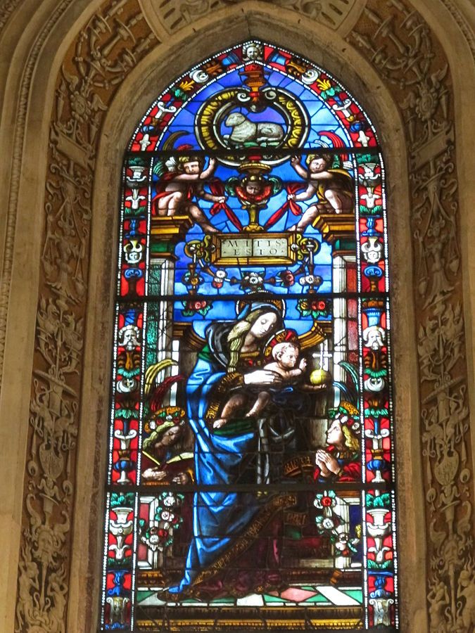 Si mise al lavoro per la vetrata nel 1497 e nel 1503 l’aveva già fatta realizzare e si trovava dove la vedete oggi. La scena è dominata dalla Madonna con Bambino e immediatamente sotto di loro compare lo stemma della famiglia Strozzi. Più in basso si vedono i Santi protagonisti degli affreschi: san Filippo e San Giovanni.