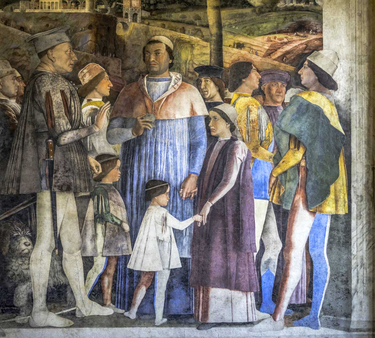 Così nel secondo affresco, il Mantegna rappresenta proprio l’incontro di Ludovico con il figlio fresco di nomina cardinalizia. Sullo sfondo, in lontananza, si intravedono alcuni edifici romani come Castel Sant’Angelo e la Piramide Cestia. Probabilmente l’artista non aveva avuto mai modo di vedere Roma di persona ma la conosceva mediante i racconti di altri che avevano visitato la città eterna.