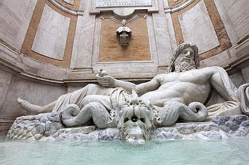 The Marforio is located inside a niche. It rests on his right side and a drapery covers his left shoulder and legs.