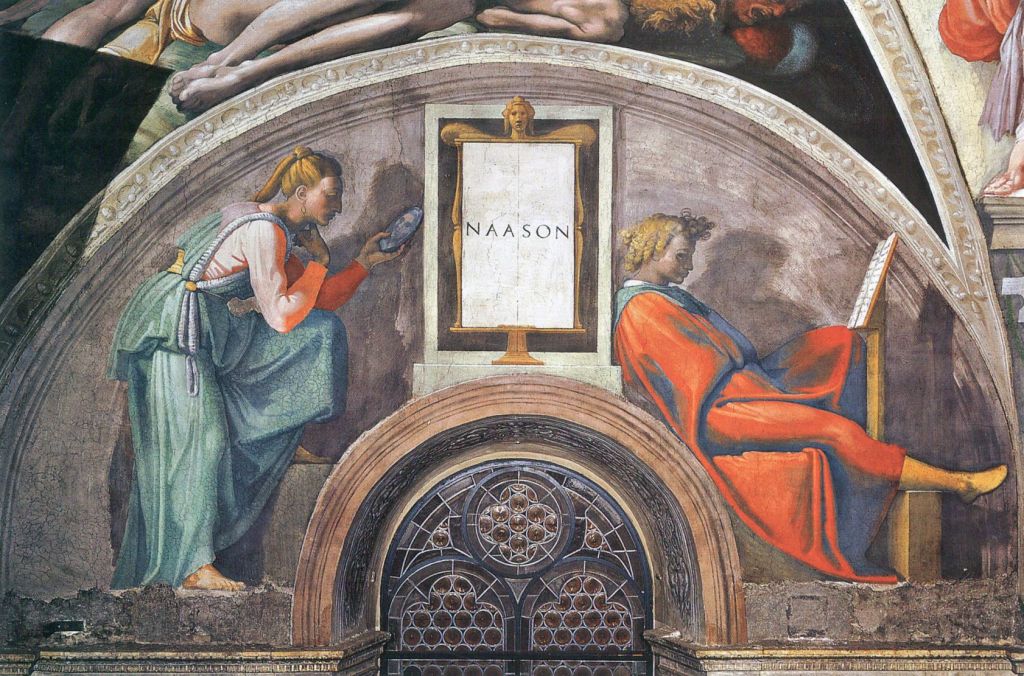 Nella parte destra della lunetta affrescai Naason con il volto incorniciato da riccioli biondi. Ha una posa semi sdraiata e davanti a se ha il un leggio che sta guardando con aria scocciata o forse preoccupata.