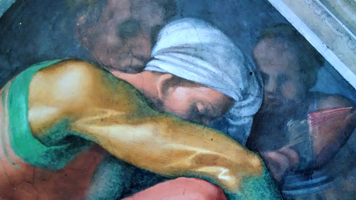 Regarding the realization of this sail, I can tell you that I transferred the preparatory drawing onto the still fresh plaster using the engraving technique and then I created the entire fresco in just two days, starting with the figures in the foreground on the left.