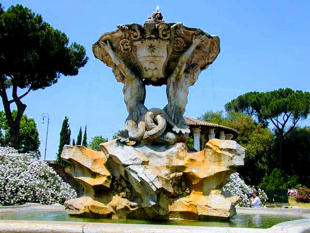 La Fontana dei Tritoni è tutta in travertino ed è circondata da sedici piccole colonne unite fra di loro da un’inferriata. La vasca basale ha la forma di una stella a otto punte ovvero raffigura il simbolo araldico della famiglia del papa: gli Albani.