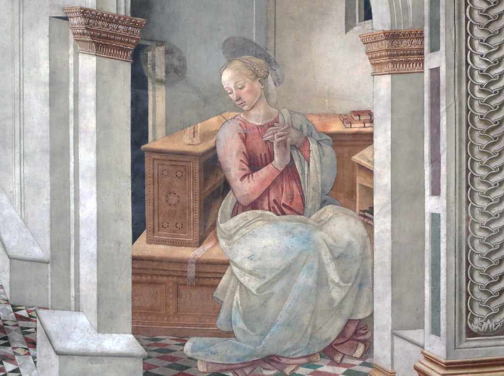 In 1456, Filippo Lippi, who was about fifty years old at the time and held the post of chaplain at the convent of Santa Margherita di Prato, was busy making the altarpiece with the Madonna giving her belt to St. Thomas. To portray Santa Margherita, he asked the Abbess if he could paint the face of a nun. He chose Lucrezia Buti, twenty years old and with an angelic face.