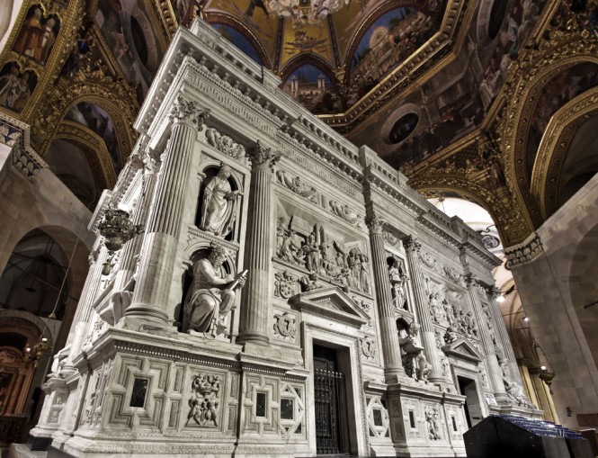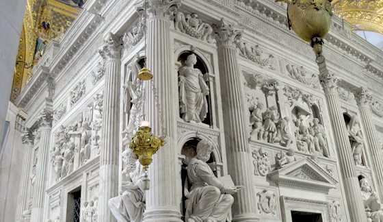 L’umile dimora è rivestita da una sorta di reliquiario costituito 610 metri quadrati di prezioso marmo bianco finemente scolpito. Come accennato prima, il progetto complessivo del Bramante risale al 1509 ma solo una decina d’anni dopo gli scultori iniziarono a metterci mano.