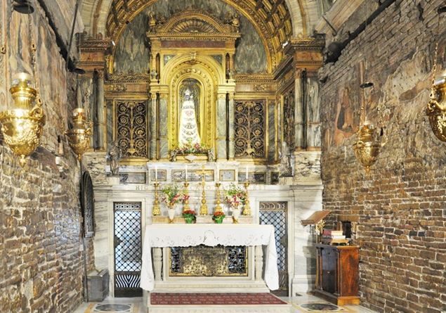 I bassorilievi raffigurano le glorie della vita terrena della Madonna e il momento dell’Annunciazione scolpito dal Sansovino si trova sopra la Finestra dell’Angelo e svolge la funzione di pala d’altare.