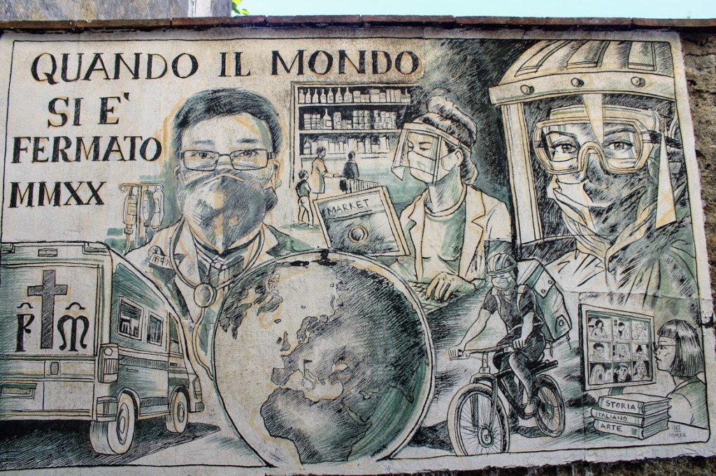 Ci sono anche graffiti però che segnano un’epoca come l’ultimo che è stato realizzato dall’artista Franco Pagliaruolo nel settembre del 2020: “Quando il mondo si è fermato”. E’ un omaggio a tutti gli eroi della pandemia tutt’ora in corso fra i quali si vede Li Wenliang, il medico cinese che per prima lanciò l’allarme messo subito a tacere.
