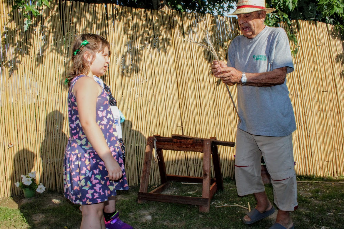 Nonno Amedeo ci ha mostrato com’è possibile estrarre la fibra della canapa che poi viene filata e tessuta, adoperando olio di gomito e un’attrezzo che si è costruito da solo perché oramai non se ne trovano più da acquistare.