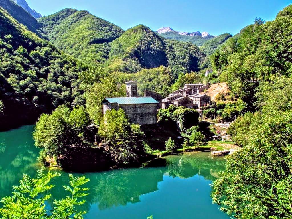 Un bacino artificiale, tetti di ardesia, casette in pietra e boschi di castagno: è la sintesi di Isola Santa, un borgo suggestivo che sembra uscito da un racconto dei fratelli Grimm.