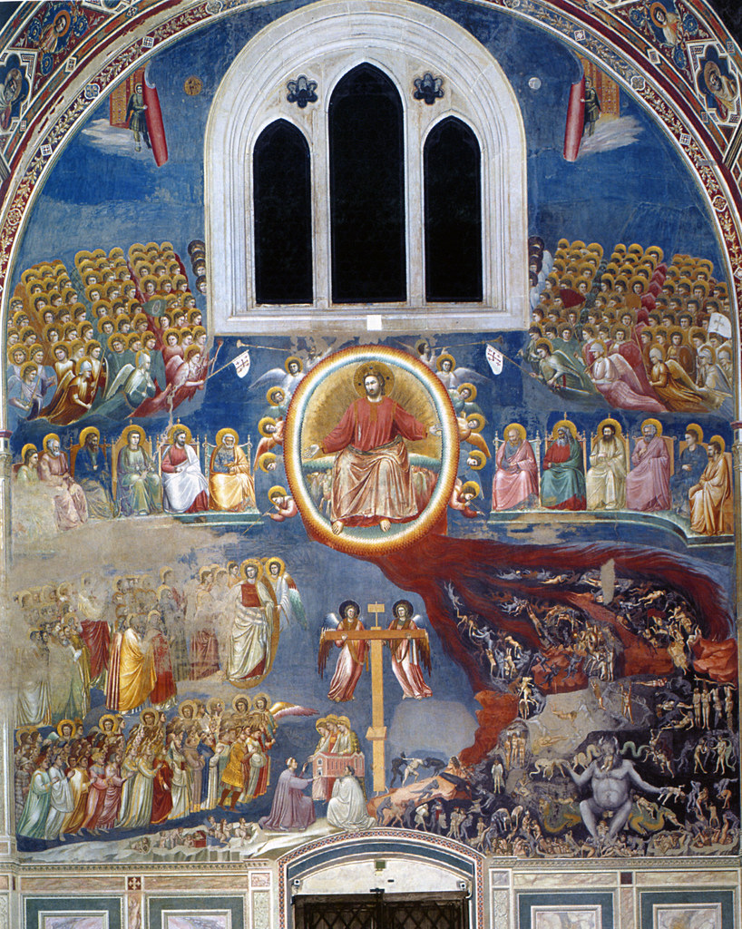 The counter-façade of the Scrovegni Chapel is entirely occupied by the Last Judgment. At the center of the scene is Christ the Judge inside the almond while on the two sides, seated on a throne, you can see the twelve apostles. The upper part of the fresco is decorated with the angelic hosts while on the lower right there is the part dedicated to hell.