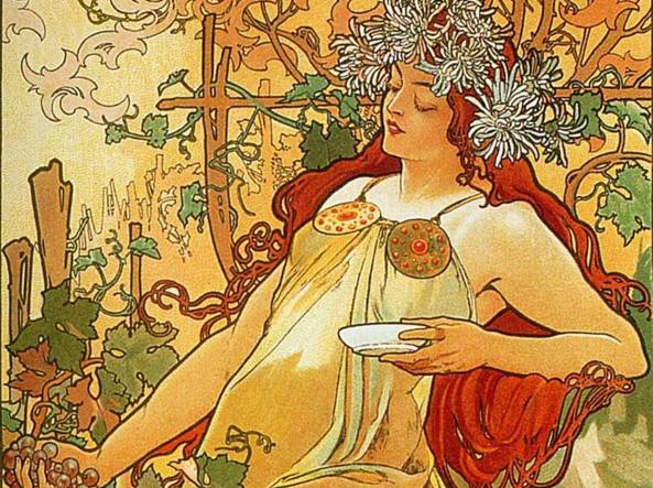 L’autunno di Mucha è un insieme esplosivo di colori autunnali: le tinte calde del giallo e del rosso, intervallate dal verde dei pampini dell’uva.