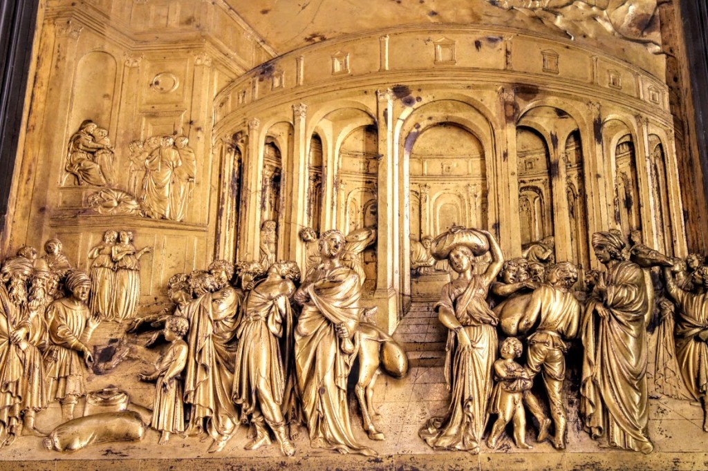 Alla fine però il Ghiberti optò per ingrandire le formelle e ridurre il numero a 10. Come fece per rispettare il programma previsto? Ci mise del suo raggruppando più episodi in una sola formella.