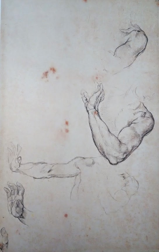 Su questo foglio che vi propongo tracciai tre studi per la posizione del busto e delle braccia di Adamo per il riquadro della volta sistina con la Cacciata dal Paradiso più due studi della mano destra dello stesso soggetto.