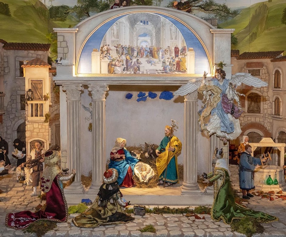 Lo sfondo del presepe suddiviso in pannelli è sempre opera della Antulov che ha riproposto le atmosfere ispirate alla Disputa del Sacramento di Raffaello mentre l’affresco che si vede all’interno del tempio è ispirato alla Villa Romana di Moregine.