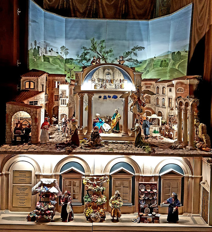 Se osservate bene la parte destra del presepe riconoscerete le architettura di San Gimignano mentre dalla parte opposta, a sinistra, ritroverete le atmosfere tipiche di Spoleto e San Gemini.