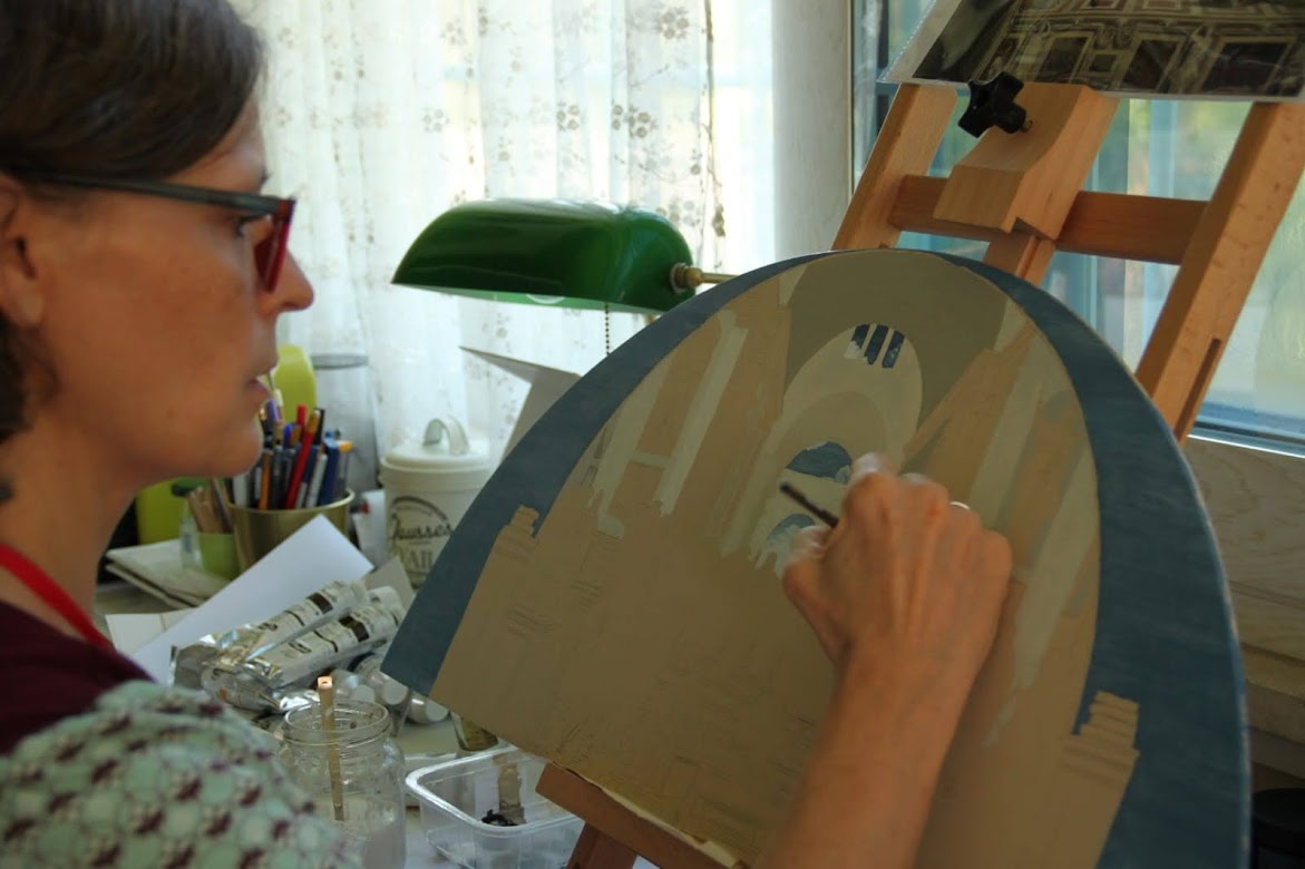 Immediatamente sopra la Natività si vede la riproduzione della Scuola di Atene di Raffaello, dipinta da Eva Antulov.