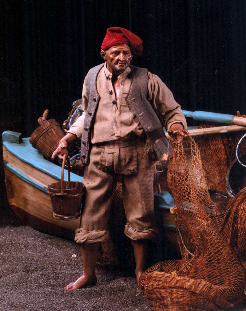 He has his trousers rolled up to the knee and his shirt open on the chest. The fisherman is depicted with or without a fishing rod but constantly near his well-stocked besce bench. With his unkempt appearance and his colorful robes, he represents life. He also recalls the fishing of souls with a clear reference to Jesus, fisher of souls.