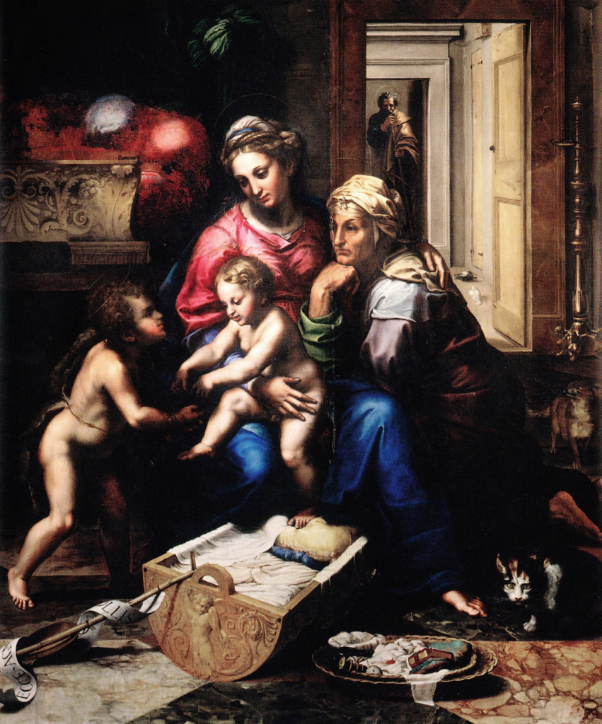 The Madonna della Gatta owes its name to the cat that appears in the foreground, at the feet of the Virgin. She looks troubled at the viewer.