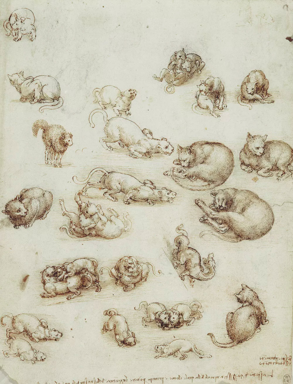 Negli studi di Leonardo da Vinci il gatto viene proposto in differenti pose non tanto realizzate con lo scopo di inserirlo in qualche dipinto poi ma per capire le sue pose e il funzionamento delle sue articolazioni.