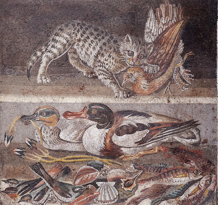 A splendid example of this is the tabby depicted in the mosaic in the House of the Faun in Pompeii while he is biting a poor partridge.