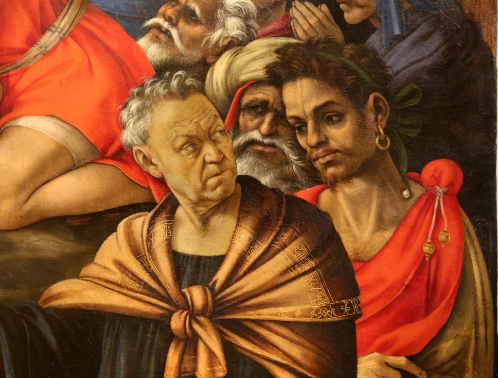 Nell’Adorazione dei Magi, alle spalle di San Giuseppe, si vede un gruppo di persone che il Vasari cita come “indiani e mori in abiti stranamente acconci”. Rappresentano i pagani accorsi da ogni dove per vedere e omaggiare il Bambino appena venuto alla luce. A questo gruppo appartengono anche i tre Re Magi in primo piano.