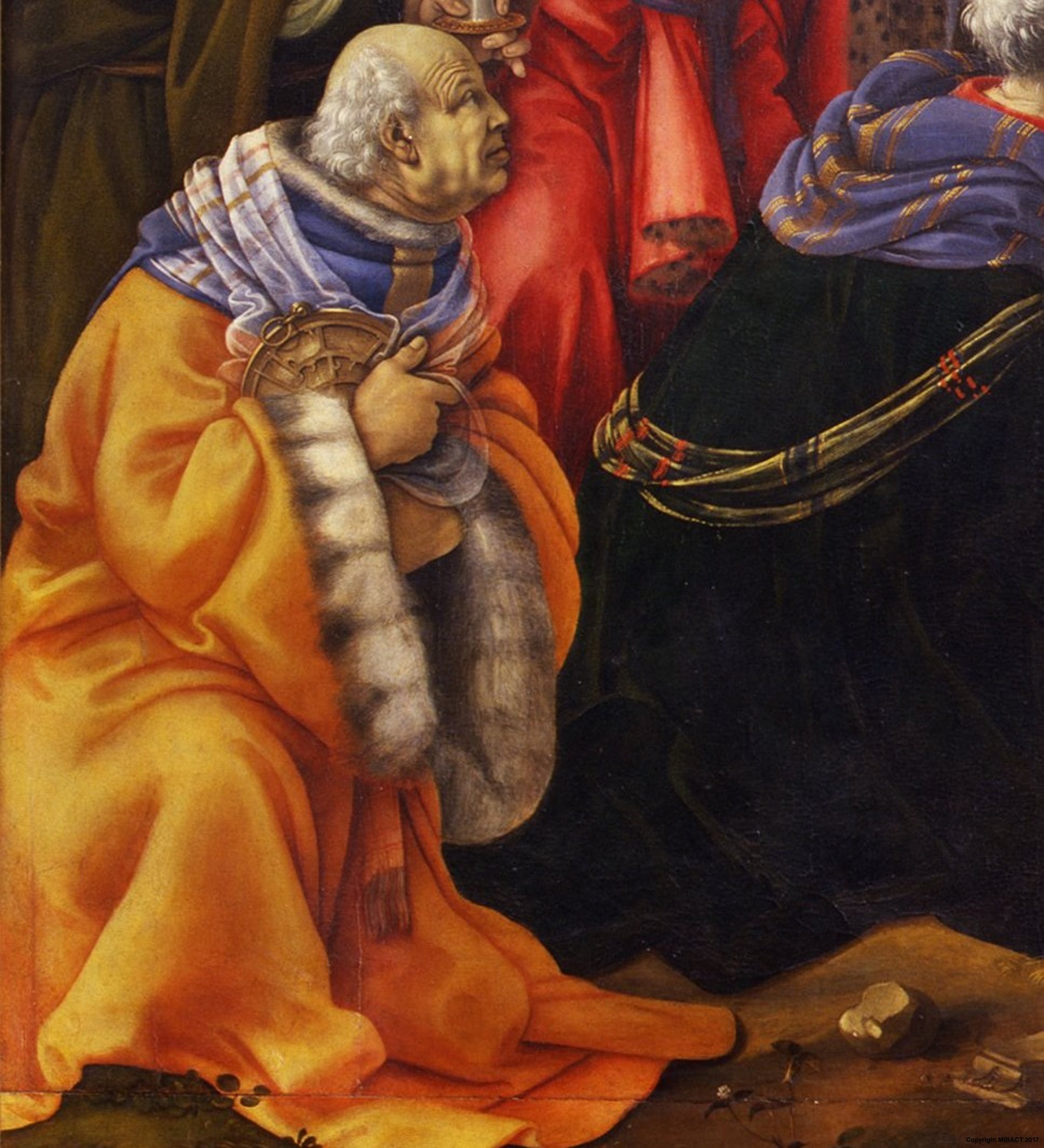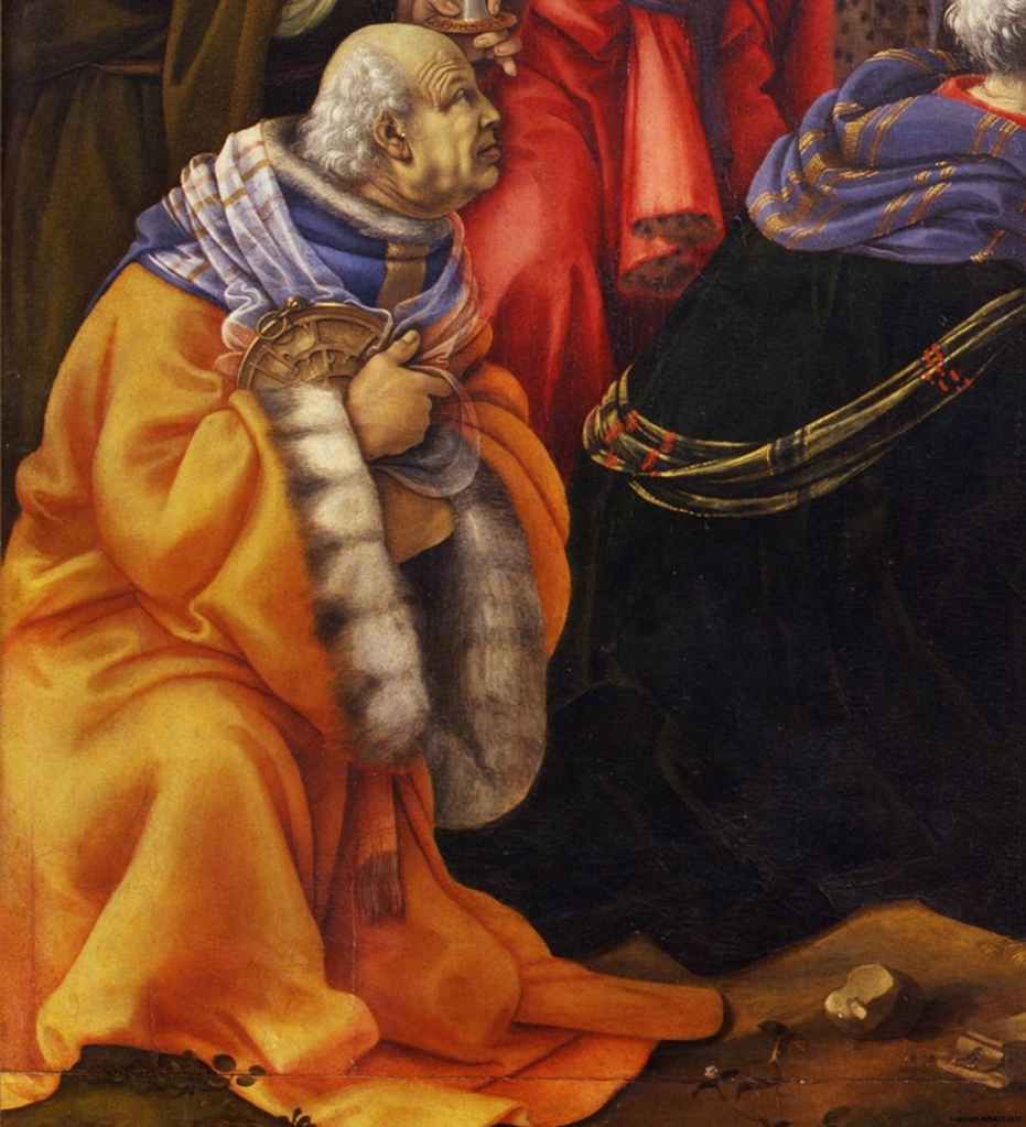 In the left-wing group Filippino wanted to include some members of the Medici family of the commoners branch, which had adhered to Savonarola’s theories. The kneeling old man richly dressed in a yellow robe bordered with an ermine that holds the astrolabe to himself is Pier Francesco di Lorenzo, nephew of Cosimo the Elder.