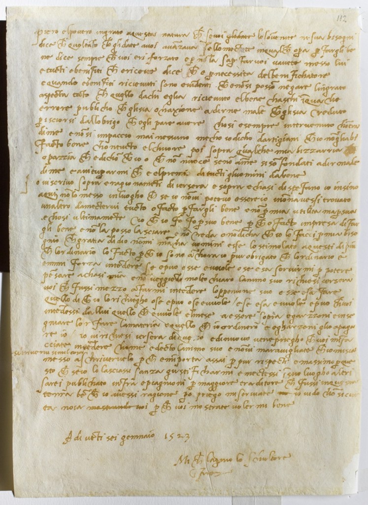 Però priego mi serviate. Io vi do chon sicurtà noia perché voi mostrate volermi bene. A dì venti sei gemnaio 1523. Michelagniolo schultore in Fire[n]ze.