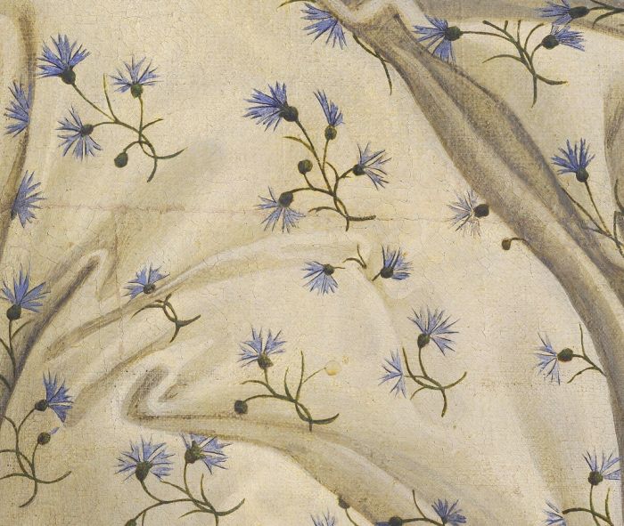 Flora’s robe is decorated with delicate cornflowers.
