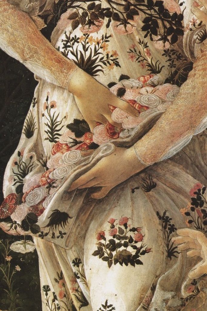 la meraviglia di certe opere è così immensa che ogni dettaglio ci appare straordinario. Oltre ai fiori, un vero tripudio di primavera, io adoro moltissimo le figure femminili, che qua appaiono soavi, leggere, romantiche e delicate allo stesso tempo. Di sicuro questa è una delle opere più belle in assoluto 👍👍👍👍👍