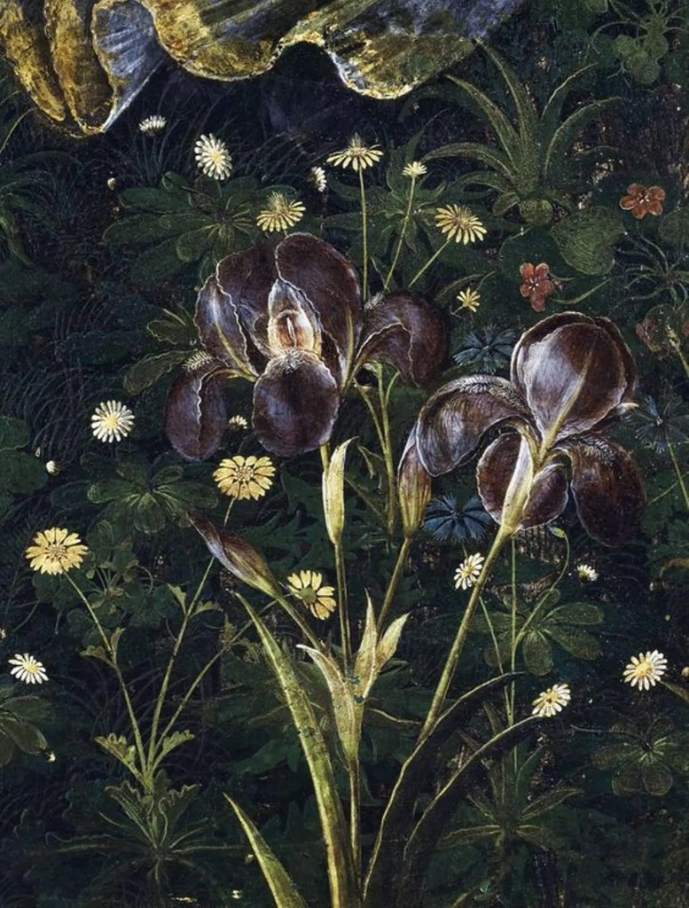 Nel giardino fiorito si vedono anche iris, ciuffi d’erba ed eleganti violacciocche gialle.