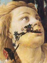 Dalla parte opposta Zefiro con le gote gonfie di aria e la veste scompigliata dal vento, trattiene Clori. Lei con uno sguardo smarrito cerca di sfuggire ma ormai è stata fecondata e dalla sua bocca escono i fiori che vanno a posarsi direttamente sull’abito di Flora.