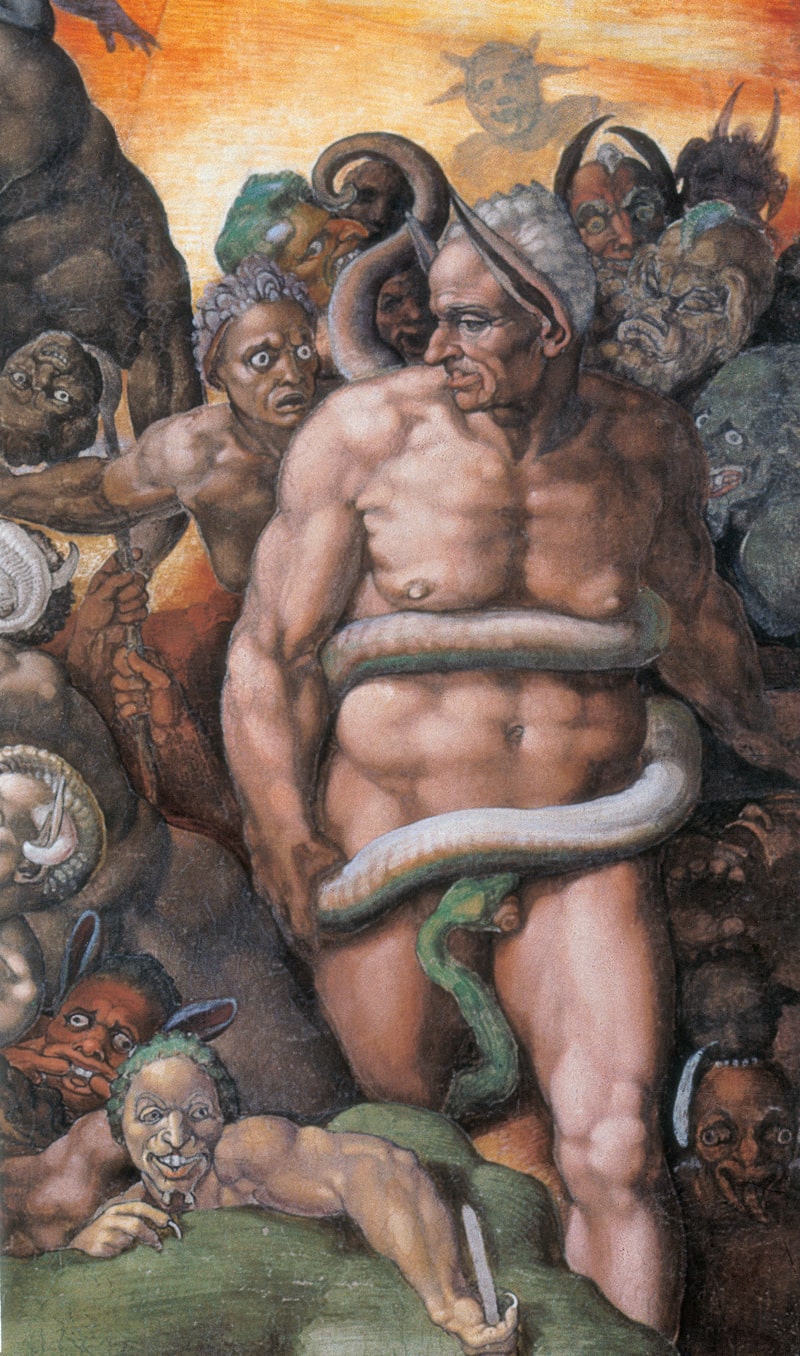Appena girò le spalle e iniziò ad avviarsi verso l’uscita, iniziai a dipingere il suo volto a Minosse, il giudice infernale raccontato anche dal mio amatissimo Dante. Lo posizionai immediatamente sopra la porta d’uscita della Cappella Sistina in modo che tutti lo avrebbero visto avrebbero visto passando di lì.