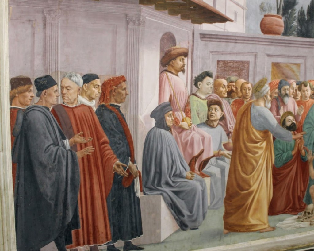Si tratta di un gruppo di persone che il maestro aveva affrescato nella Sagra del Carmine, al di sopra di una lunetta del chiostro dell’omonima chiesa.