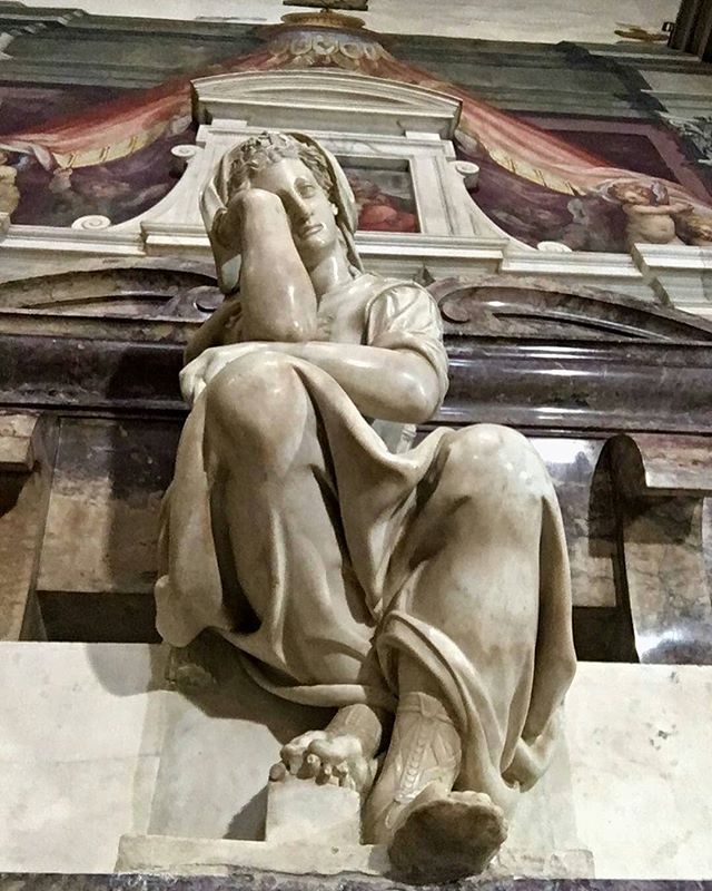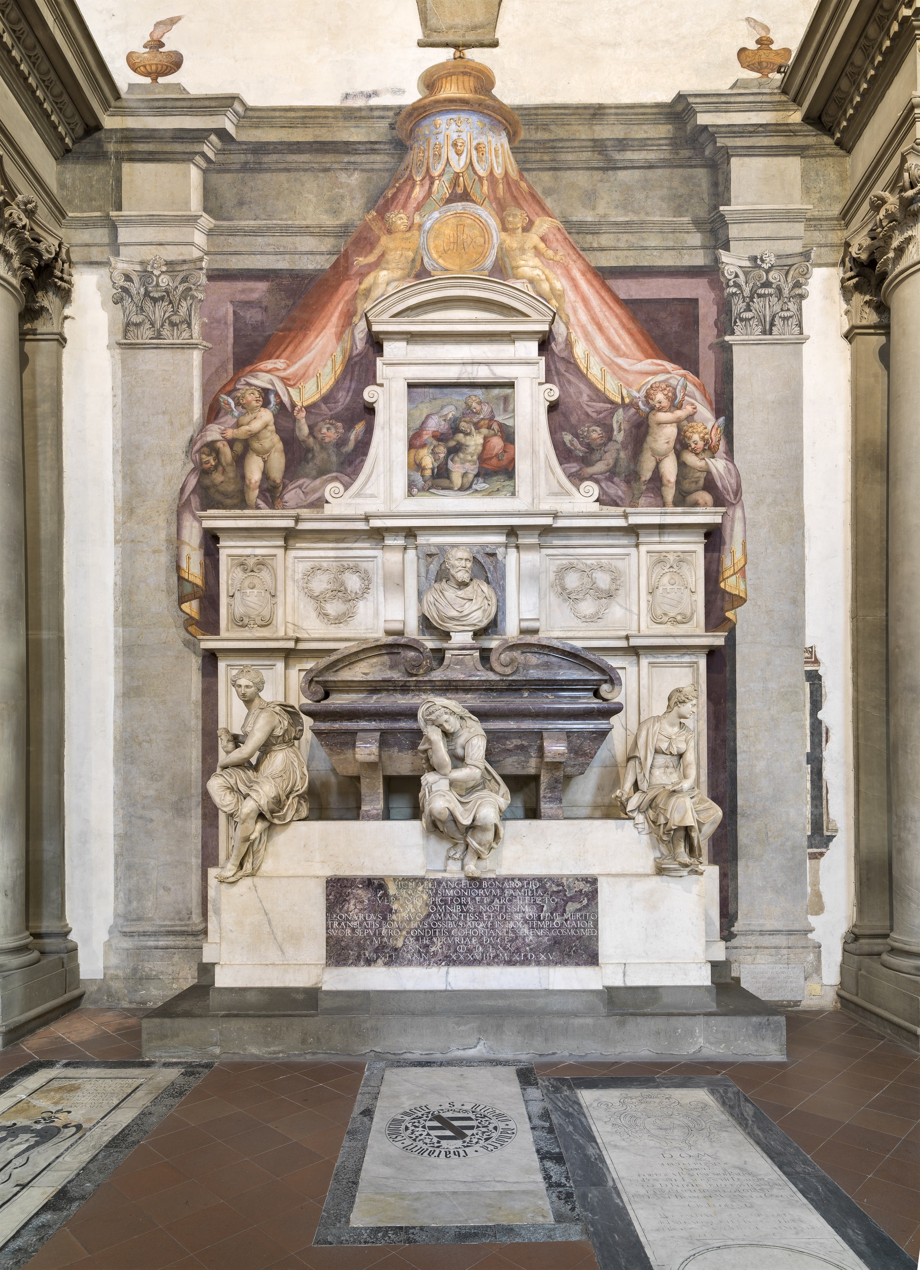 Al di sopra del sepolcro trovate il busto che scolpì Battista Lorenzi e l’affresco del Compianto sul Cristo Morto del Naldini. Le tre sculture principali sono state sì progettate dal Vasari ma le realizzarono materialmente tre diversi artisti. L’Architettura è opera di Giovanni dell’Opera, la Scultura di Valerio Cioli e la pittura di Battista Lorenzi.