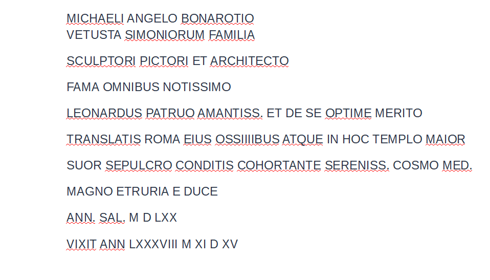 Sulla lapide che si trova immediatamente sotto al sarcofago di marmo si legge un’iscrizione in latino che non solo fa menzione del mio nome ma ricorda la mia fama di scultore, pittore e architetto.