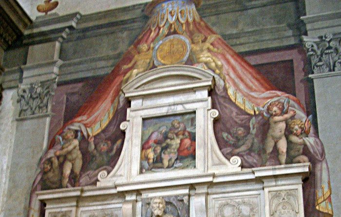 Above the tomb you will find the bust sculpted by Battista Lorenzi and the fresco of the Lamentation over the Dead Christ by Naldini. The three main sculptures were indeed designed by Vasari but they were actually made by three different artists. The Architecture is the work of Giovanni dell’Opera, the Sculpture of Valerio Cioli and the painting of Battista Lorenzi.