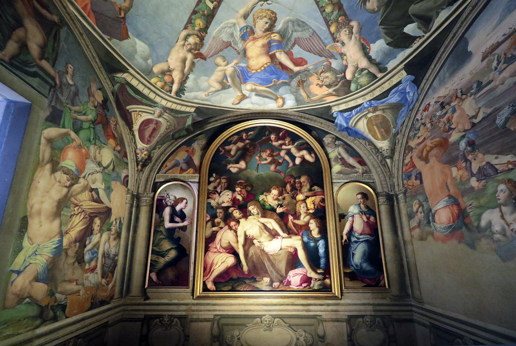 La Deposizione di Cristo che vedete al centro della cappella è un dipinto a olio su tavola che ha una storia assai singolare. Il Bronzino realizzò un primo dipinto con questo tema da sistemare sopra l’altare ma Cosimo I, tanto apprezzò quel capolavoro che volle farne dono al cancelliere di Carlo V, il cardinale Nicolas Granvelle. Quel dipinto dai colori brillanti si trova oggi al Musée des beaux Arts di Besancon mentre l’opera presente nella Cappella di Eleonora di Toledo è una copia molto più cupa realizzata sempre dal Bronzino.
