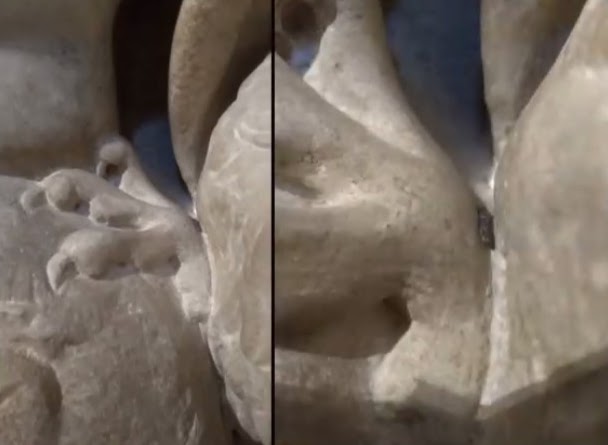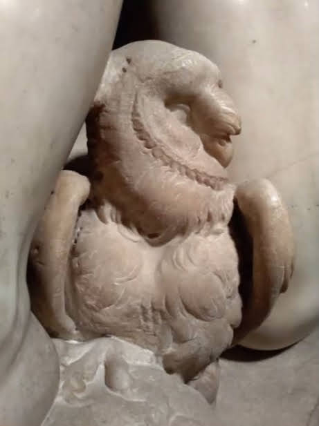 During the restoration work, something singular and curious was discovered, certainly noteworthy. Well, stuck in the paw of the barn owl is the tip of one of my chisels that still sits there well stuck in the marble.