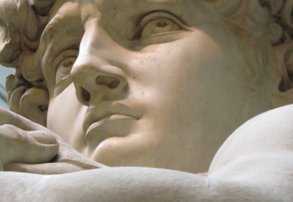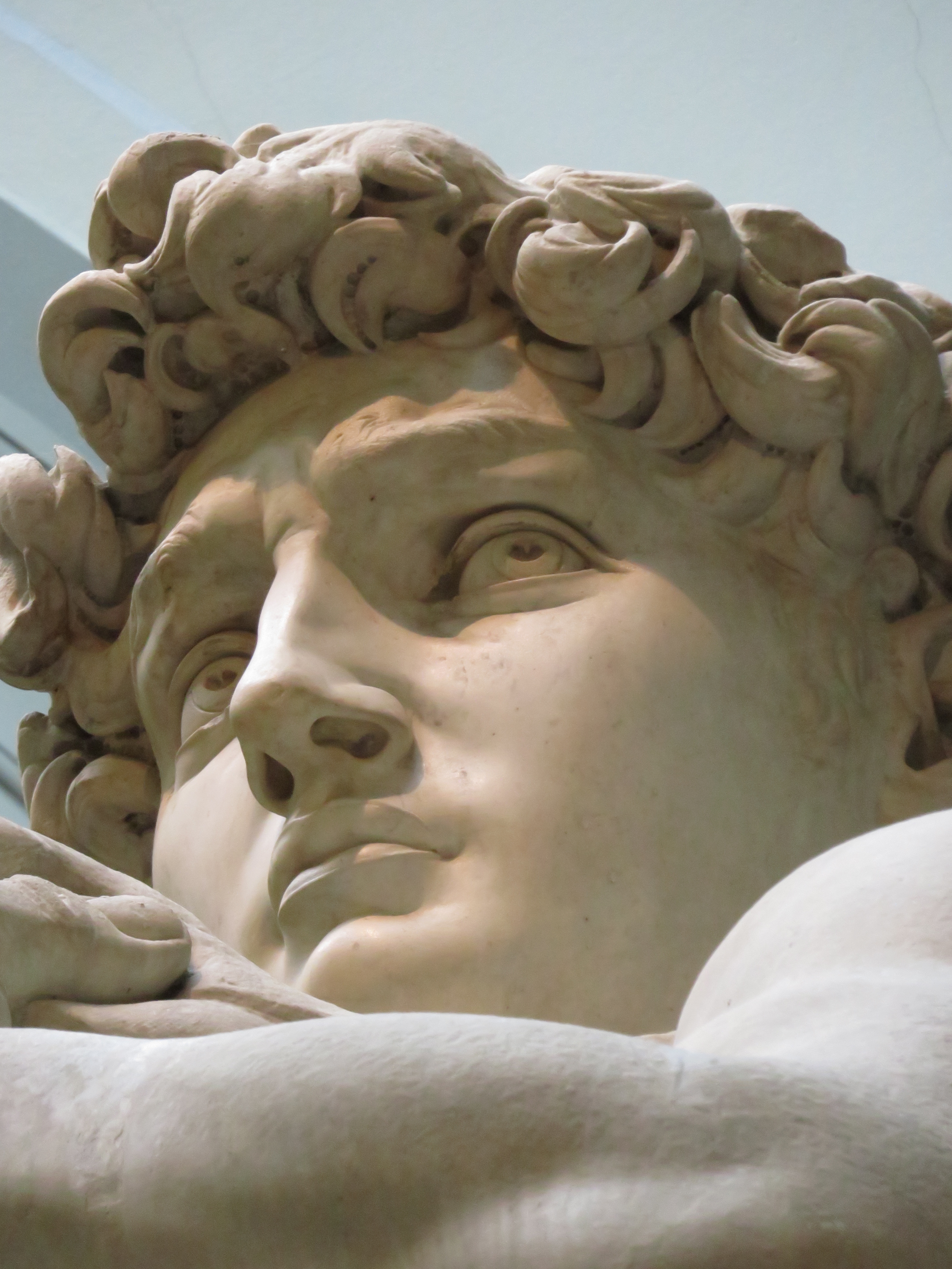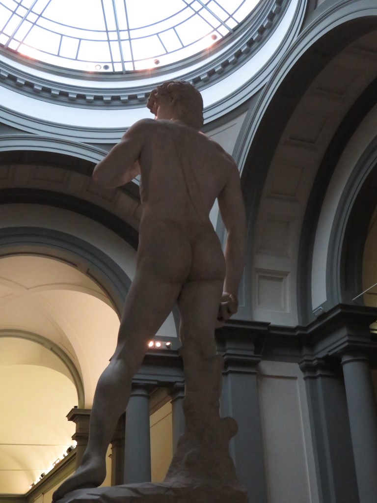The David has been standing for centuries, waiting for the challenge against the Giant, armed only with the trust in God who will make him successful in using his poor slingshot. Poor when compared to the imposing armor of the enemy, used to fighting hand-to-hand.