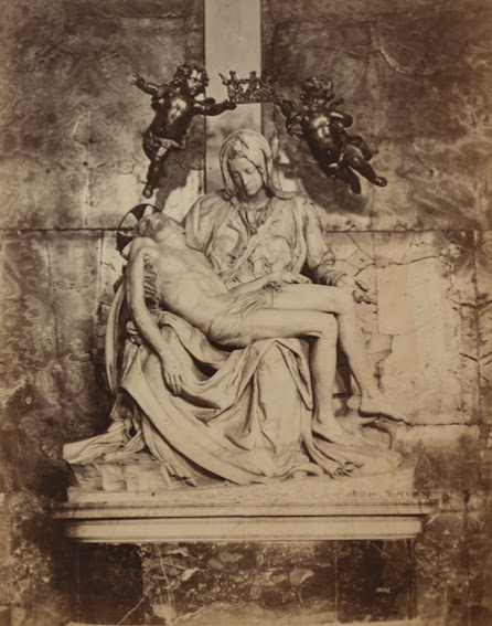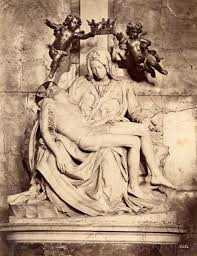 Sapete, fino agli inizi del Novecento la Pietà Vaticana aveva una corona ma l’ultima versione apposta consisteva in un diadema sorretto da due angeli svolazzanti imperniati però nella parete retrostante, sul lato destro e sinistro del braccio lungo della croce.