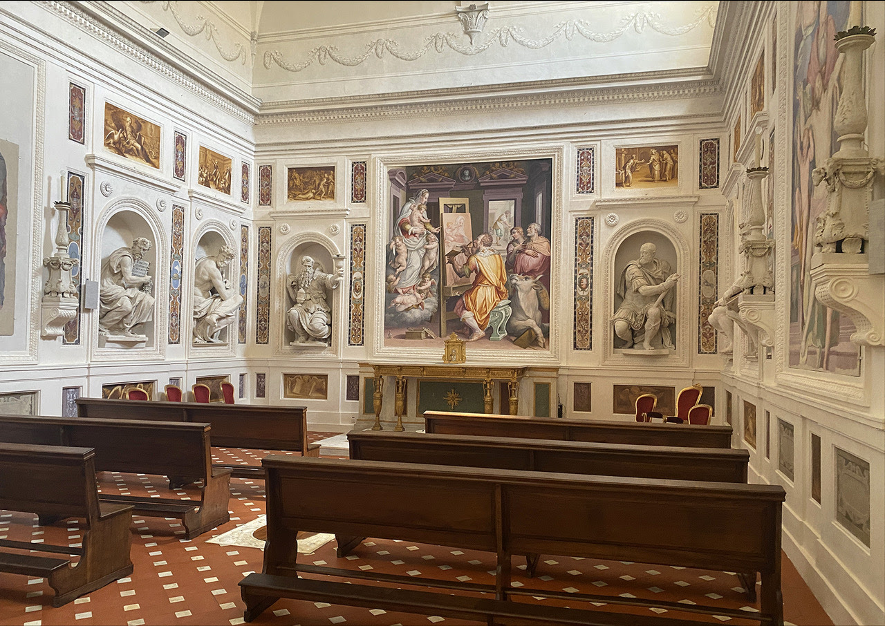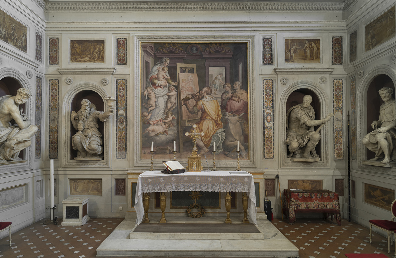 La Cappella di San Luca, o dei Pittori che dir si voglia, è un luogo simbolico della vita artistica fiorentina a partire dal 1565, anno dopo la mia morte. Fu edificata grazie all’impegno del Montorsoli che riuscì a convincere il priore generale fra Zaccaria Faldossi ad accogliere e a donare alla appena nata Accademia delle Arti e del Disegno alcuni spazi conventuali.