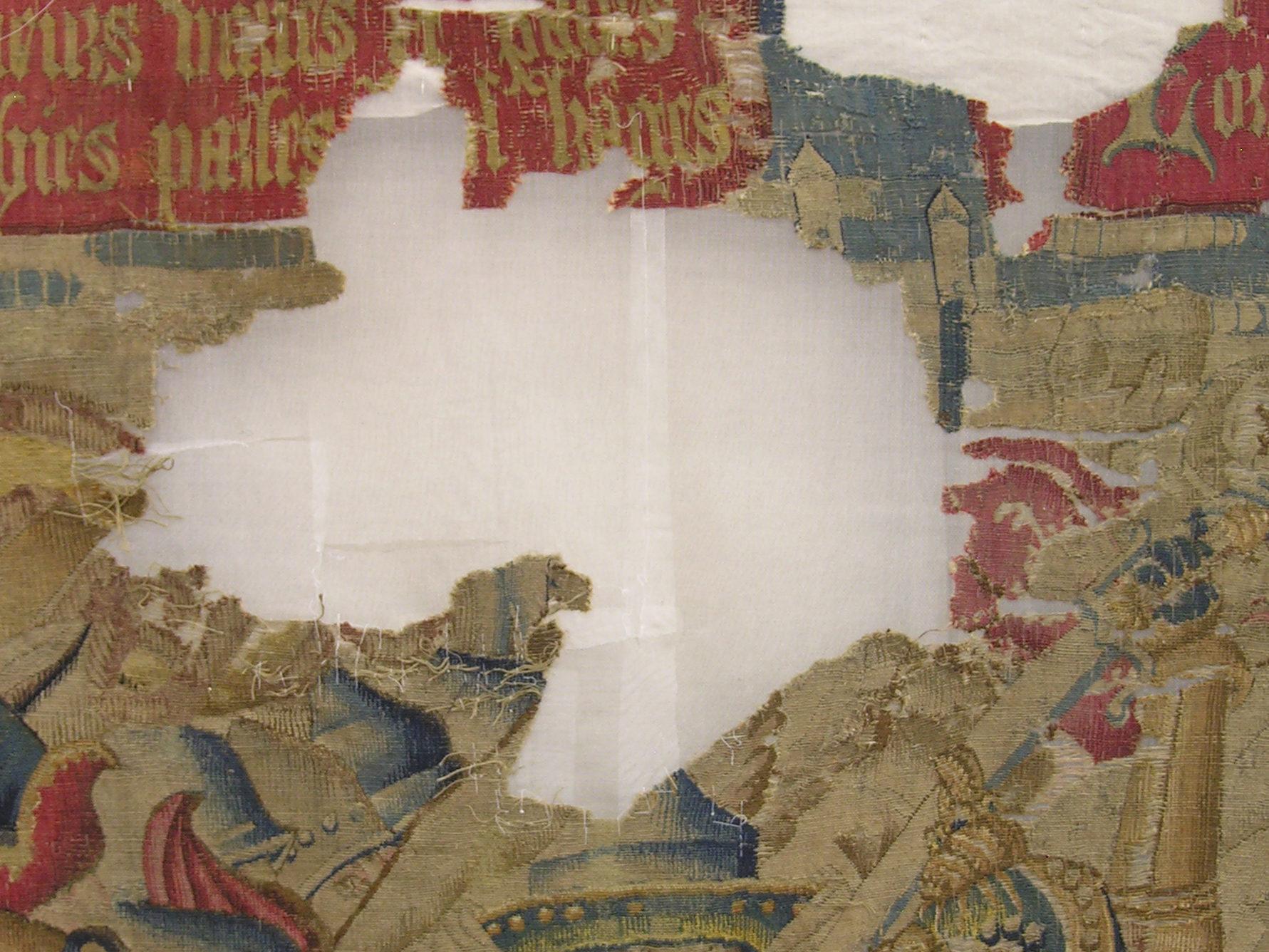 Nella parte di arazzo appena restaurato si vede Orlando in primo piano a destra in groppa al cavallo rampante mentre impugna la mitica spada Durlindana, con tanto di scritta a lettere cubitali DURENDAL. Orlando sta combattendo contro l’emiro di Babilonia Baligante, anche lui a dorso di cavallo.