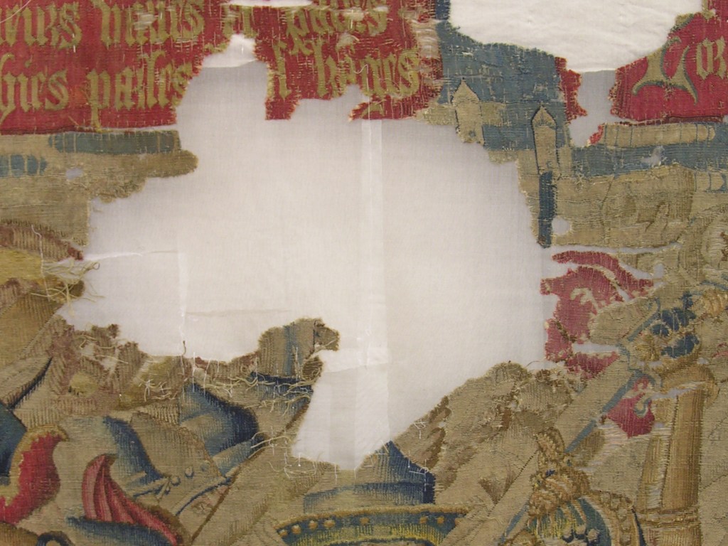 L’arazzo è stato cucito sopra un supporto di rete rigida per stabilizzare le aree mancanti e pulito mediante l’immersione in acqua. Le lacune sono state reintegrate con un complesso lavoro di reinserimento di trame e orditi: solo così è stato possibile restituire all’opera la stabilità meccanica e una buona leggibilità.