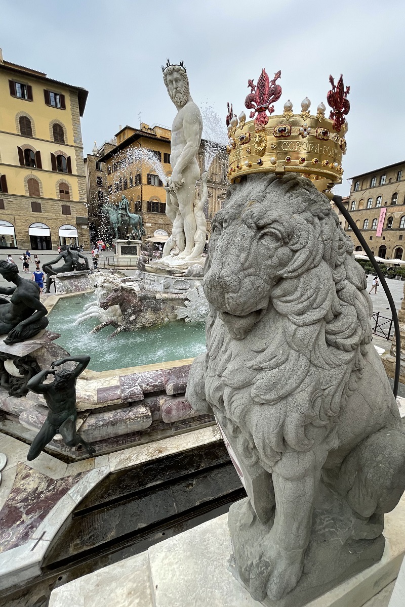 Four days before San Giovanni, patron saint of Florence, centuries ago the head of the Marzocco was decorated with a sparkling crown to indicate popular power.