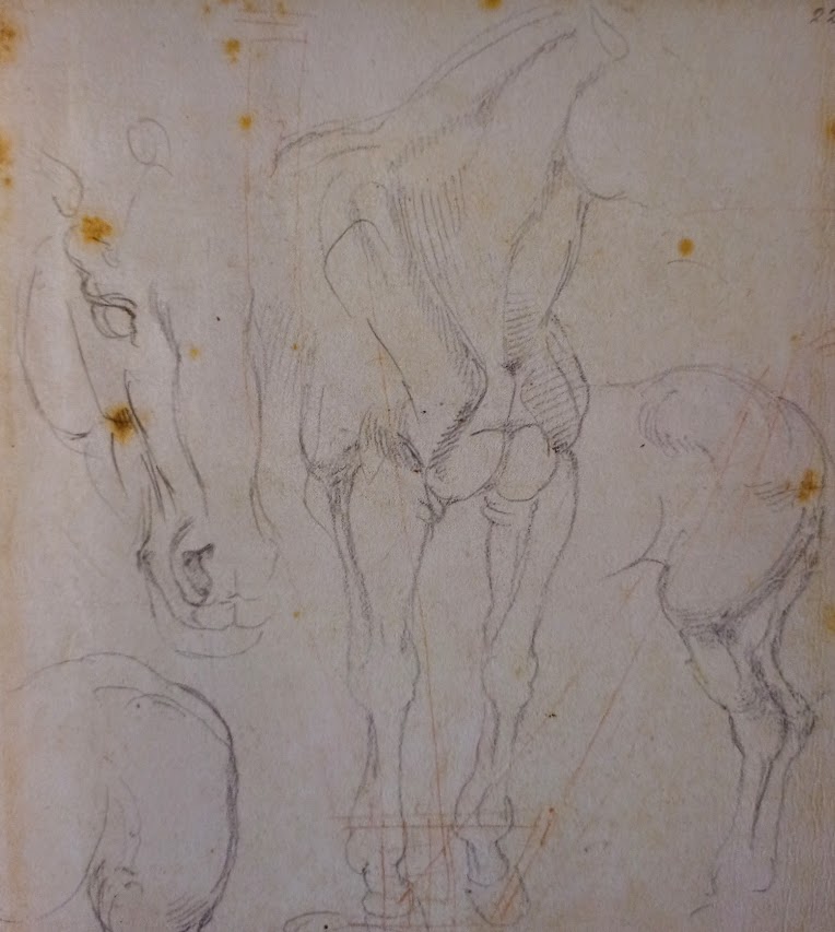 Among my drawings that have come down to your days there is one I want to talk to you about. It belongs to the Casa Buonarroti collections and includes studies for a horse. Scholars have long debated the attribution of this sheet to me as well as the destination of those drawings.