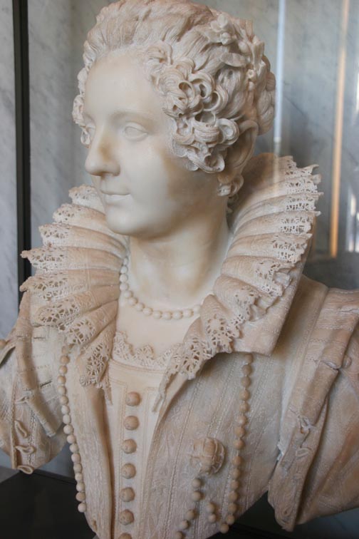 That white face turned to the side and framed by the refined lace and those strings of pearls were sculpted with an out of the ordinary mastery. Look at the precious jewel buttons and the care that has been put into reproducing every detail of the damask dress.